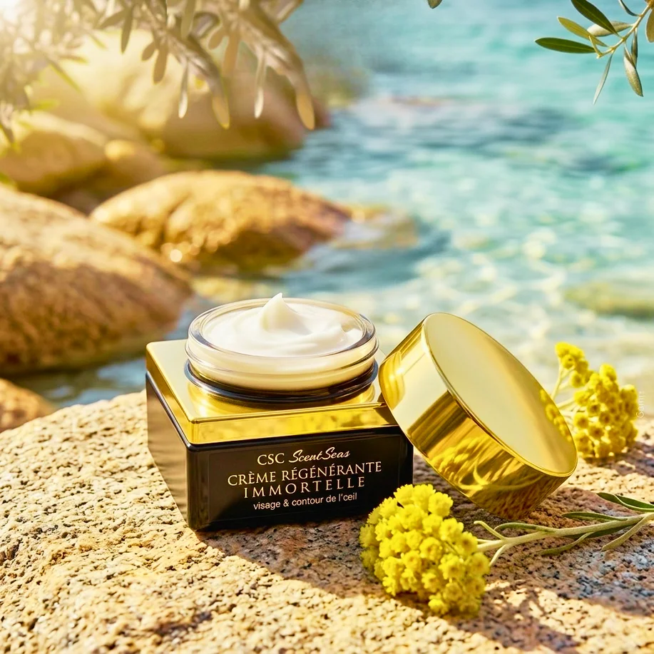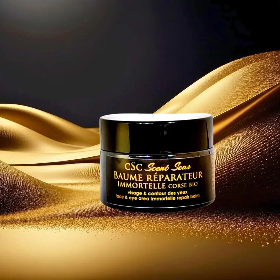 Soins visage et corps enrichis en huile d’immortelle de Corse, reconnue pour ses propriétés anti-âge et réparatrices.